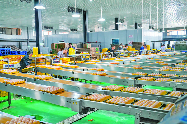 ◀山西晋龙集团临猗八百万只蛋鸡养殖项目车间内工人正热火朝天拣装鸡蛋。 本报记者 陈方斌 摄
