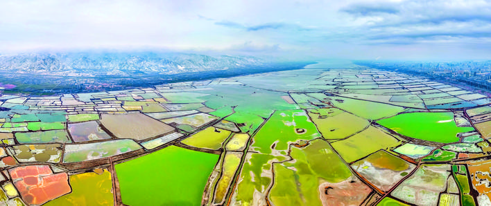 3月3日,一场春雪悄然降临,七彩盐湖和远处中条山披上素雅银装,宛如一幅水墨长卷。本报记者 陈方斌 摄