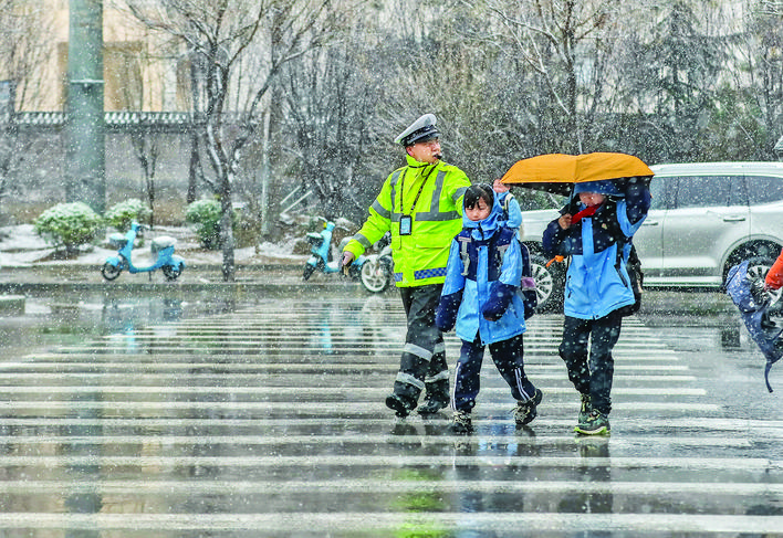 3月3日,我市中心城区迎来降雪天气,市公安局盐湖分局交警大队民警在魏风小学门口执勤护学,确保过往家长及学生出行安全。 本报记者 金玉敏 摄