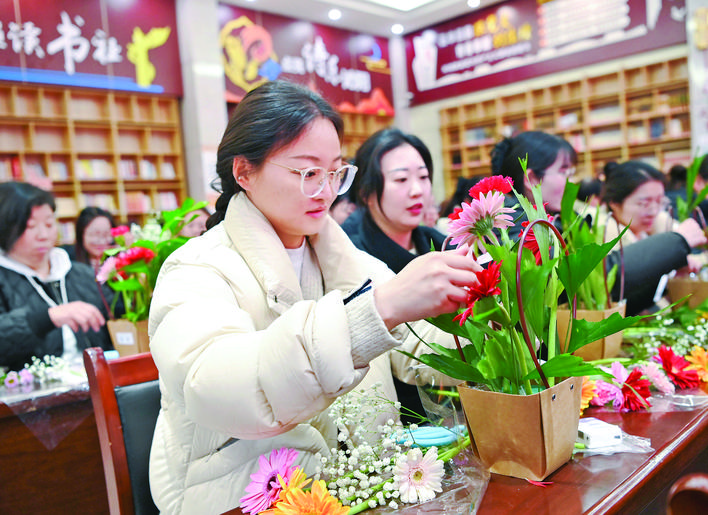 3月5日,在河南省沁阳市妇联组织的迎“三八”美学与创意插花团建活动中,女职工在学习插花技艺。 新华社发(杨 帆 摄)