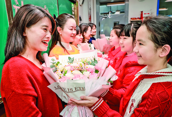 3月6日,湖北省武汉市未来实验美林小学学生为女教师献上鲜花。 新华社发(赵 军 摄)