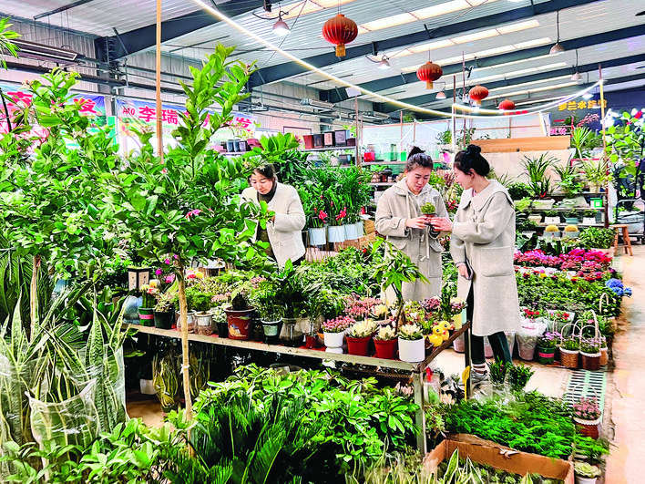 3月8日,市民在中心城区一花卉市场欣赏、购买鲜花,将春天“带”回家。