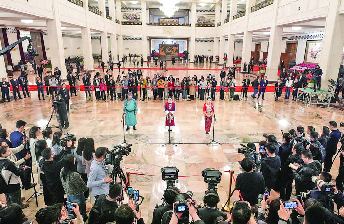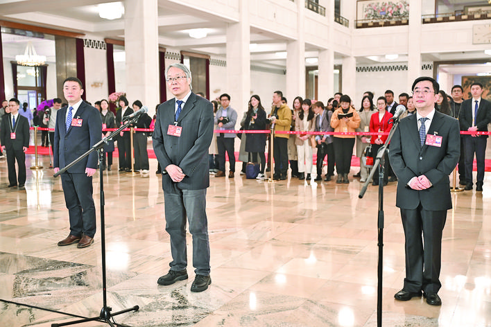3月10日,全国政协十四届三次会议第三场“委员通道”集体采访活动在北京人民大会堂举行。 新华社记者 金良快 才 扬 摄