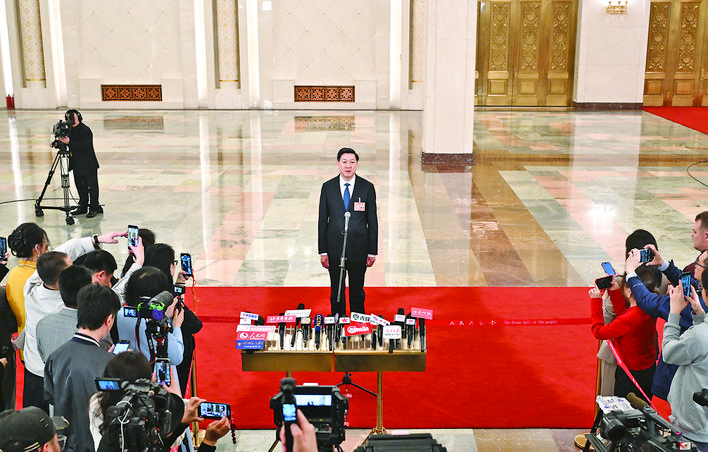◀3月11日,第十四届全国人民代表大会第三次会议第三场“部长通道”集中采访活动在北京人民大会堂举行。这是国家体育总局局长高志丹接受媒体采访。 新华社记者 陈晔华 摄