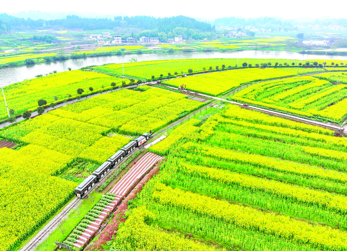 3月12日,游客乘坐“小火车”在重庆潼南崇龛花海景区游览(无人机照片)。 早春时节,重庆市潼南区的32.2万亩油菜花竞相绽放,成为春日里一道靓丽的风景线。 近年来,潼南区坚持“绿水青山就是金山银山”的生态发展理念,深入挖掘“油菜花经济”的潜力,以花为媒,大力推进农文旅融合发展,有效助力农民增收和乡村振兴。 新华社记者 王全超 摄