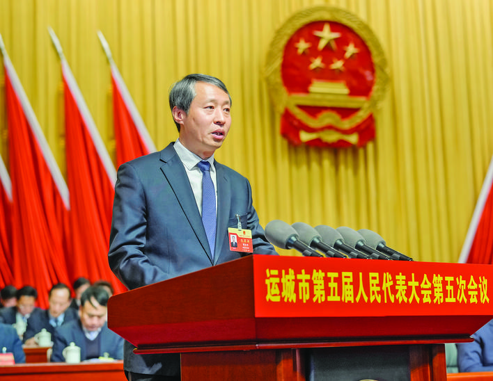 2月25日,在运城市第五届人民代表大会第五次会议上,那志茂作市人大常委会工作报告。 本报记者 闫 鑫 摄
