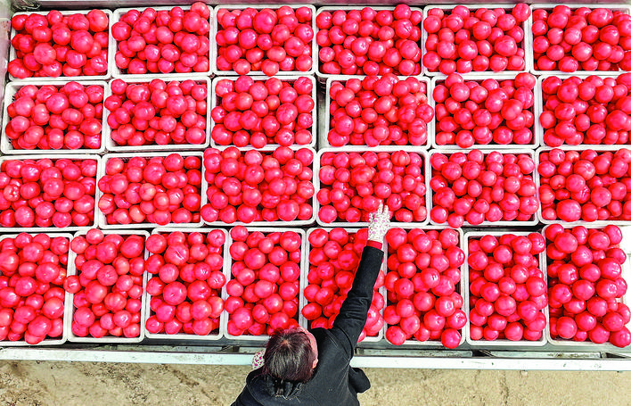 3月12日,稷山县蔡村乡大李村一蔬菜专业合作社的社员对采摘下的西红柿进行装筐。