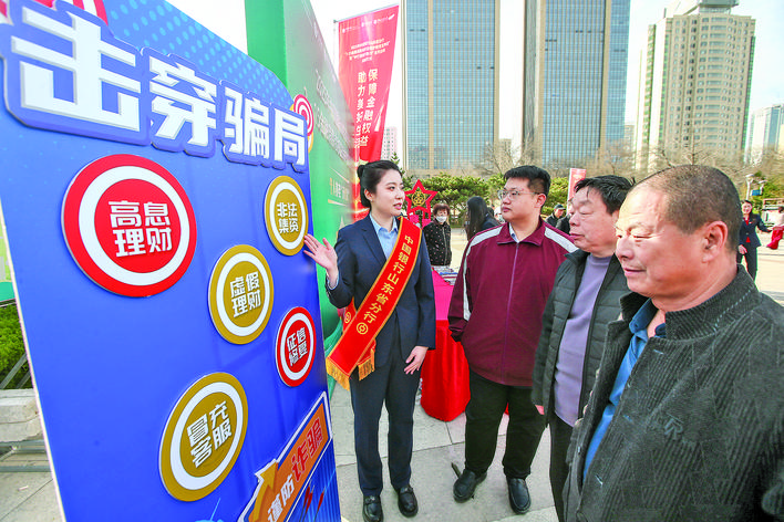 3月14日,在山东省济南市槐荫广场,银行职员为市民讲解金融领域反诈常识。 在3月15日国际消费者权益日即将到来之际,各地开展相关活动,维护消费者合法权益,提高人们的消费安全意识。 新华社发(郝鑫城 摄)