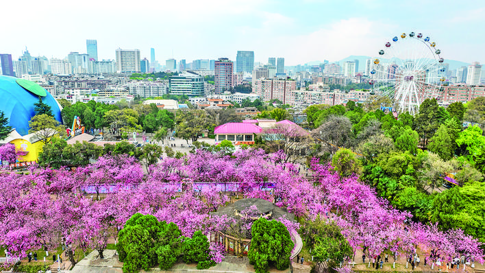 昆明圆通山公园里盛开的樱花(无人机照片,3月14日摄)。 近日,云南昆明圆通山公园的樱花进入盛花期,吸引众多市民游客前来踏青赏花,感受春天的气息。 新华社记者 胡 超 摄