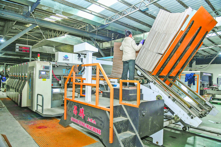 近日,稷山县翟店印刷包装文化产业园区一企业员工在加工纸包装产品。