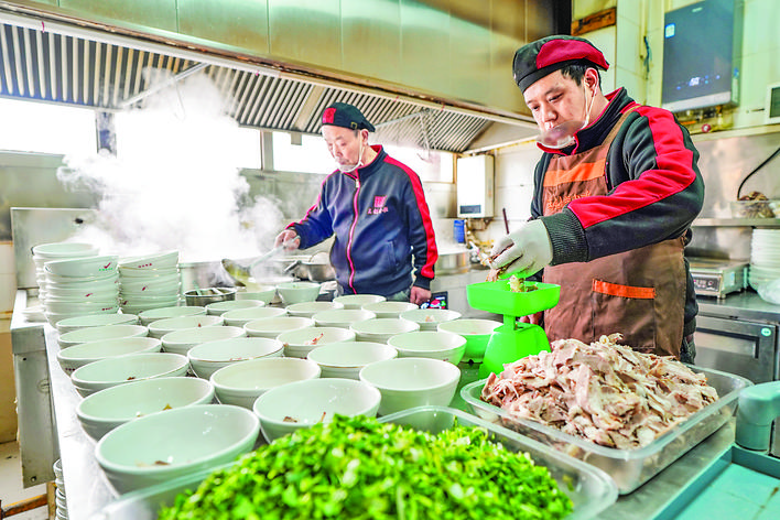 店内,一个竖立的红色标志牌格外醒目,上面写着:“‘四菜一汤一饼’展示档口。”透过该档口的空隙可以看到,厨师正在将清洗后的羊肉放入锅中熬制羊汤,熬制关公羊汤的水是来自中条山附近解州镇的山泉水,严选的本土食材是铸就独特运城风味的关键。