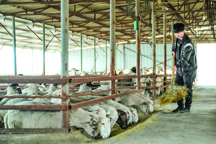 临猗县庙上乡北杜村的光明羊场内,仵雷正在喂养萨福克羊。 本栏图片均由本报记者 陈方斌 摄
