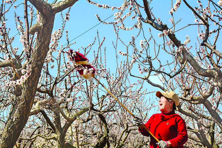 3月16日,永济市城西街道西姚温村村民在给杏花进行人工授粉。
