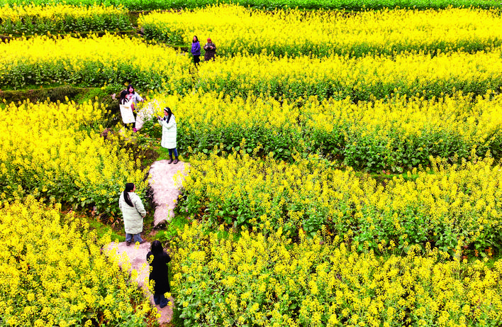 3月17日,游客在湖北省宣恩县长潭河侗族乡甘露村的油菜花田里赏花游玩(无人机照片)。 各地春花陆续绽放,神州大地处处都是烂漫春景。 新华社发(宋 文 摄)