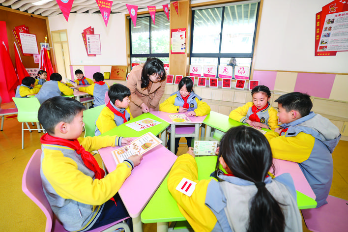 3月17日,杭州市长寿桥岳帅小学老师为学生讲解健康均衡膳食知识。 近期,浙江省杭州市各级医院逐步开设体重管理门诊,同时学校加强健康均衡膳食教育,倡导并推广文明健康的生活方式,提升市民体重管理意识与技能。 新华社记者 江 汉 摄