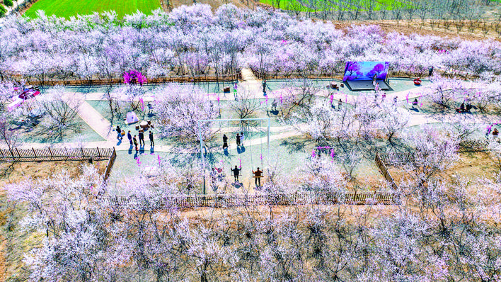 3月18日,游客在垣曲县皋落乡岭回村千亩桃花林中拍照留念。 近日,岭回村千亩山桃花竞相绽放,吸引四面八方的游客来此赏花。近年来,岭回村依托桃花资源,大力发展“赏花经济”,通过举办桃花节,推动生态旅游与乡村振兴深度融合。 本报记者 陈方斌 摄