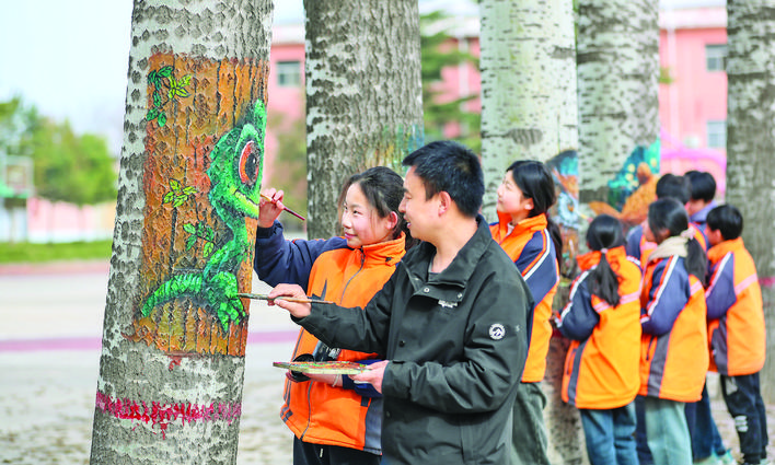 3月16日,平陆县张村镇张村中心校师生在校园里上美术课。该校打造以树画为载体的校园文化,组织师生在校园主要通道两侧的树木上绘画十二生肖等图像,深受学生们的喜爱。 本报记者 金玉敏 摄