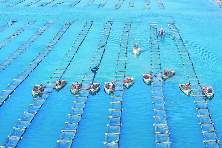 ▶3月20日,在山东省荣成市天海湾海洋牧场海参养殖区,渔民们进行海参苗管护作业。 目前,荣成市海参养殖面积近23万亩,年产值超60亿元,海参养殖已成为当地渔民增收的支柱产业之一。 新华社发(李信君 摄)
