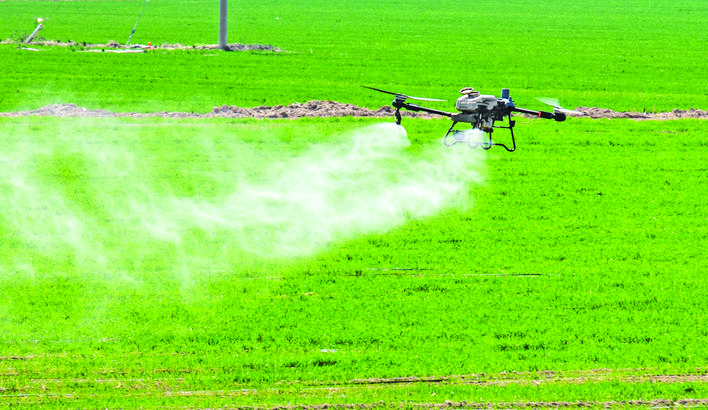3月20日,永济市黄河滩麦田,无人机在喷洒农药,助力小麦丰产增收。 特约摄影 姚中吉 摄