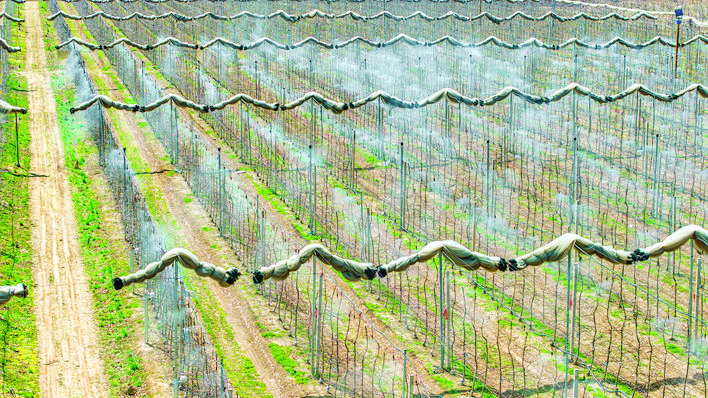 ▼北辛乡平宜村一“郇阳果园”内,现代节水灌溉设施在微喷浇水。