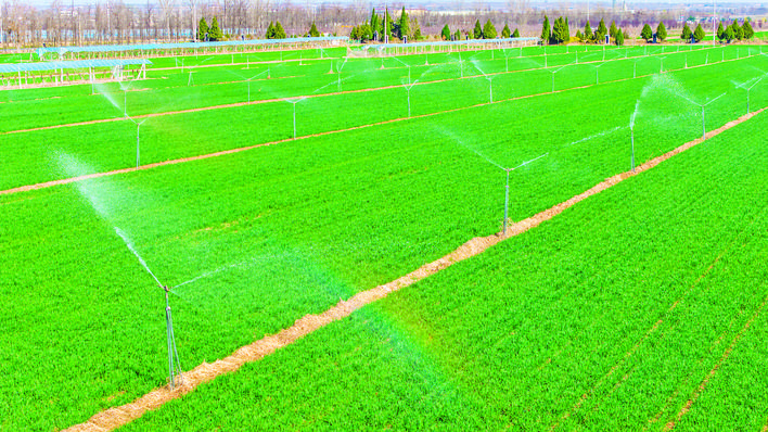 眼下正值小麦起身期,记者在嵋阳镇祁任村的一片麦田里看到,喷灌杆整齐排列,细密水珠洒落在嫩绿麦苗上。在村头另一片麦田里,黑色滴灌带若隐若现于郁郁葱葱的麦苗间,为小麦输送关键养分。
