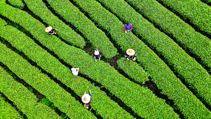 三江侗族自治县同乐苗族乡寨大村的茶农在山上采茶(3月21日摄,无人机照片)。 春节过后,广西三江侗族自治县近500家茶企、专业合作社、家庭农场,带动30多万涉茶群众,抢抓春茶黄金季,全力推动茶叶精深加工生产。 新华社记者 张爱林 摄