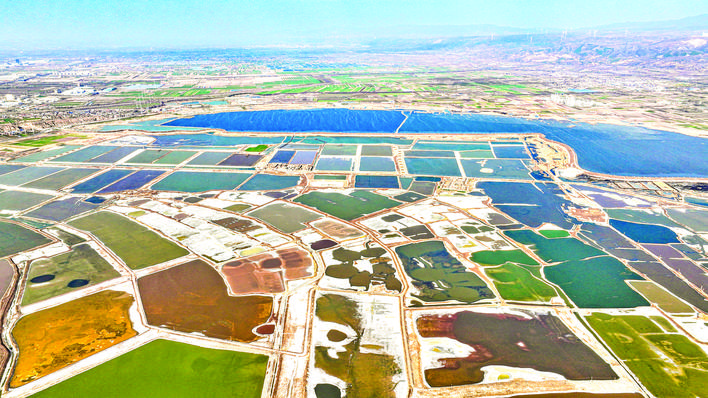 ▲3月21日,无人机拍摄的七彩盐湖,湖水在阳光的照射下呈现出梦幻般的色彩,宛如一个天然的调色盘。