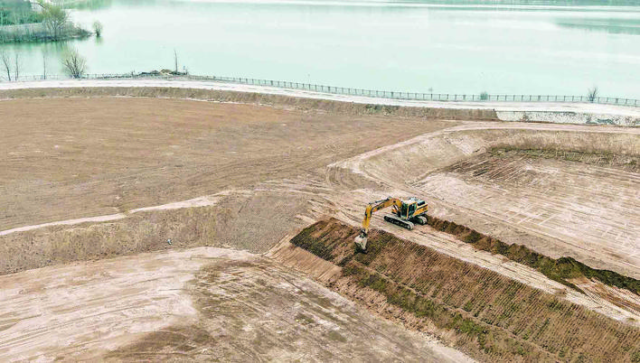 3月20日,黄河流域平陆干流段水环境综合治理工程项目施工现场,大型机械正在作业。