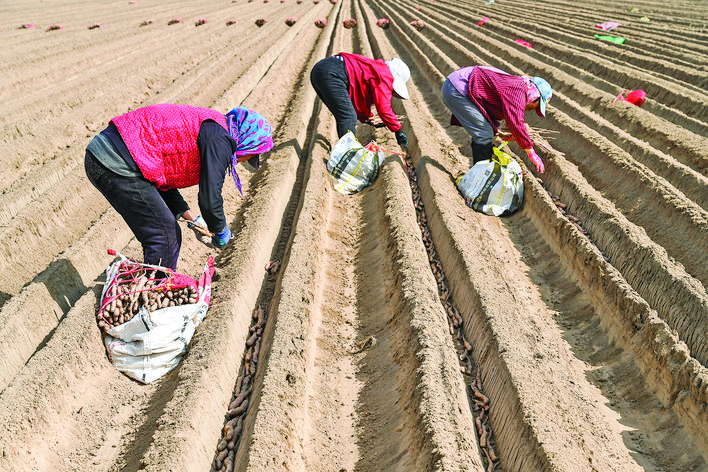 ◀3月23日,永济市蒲州镇的黄河滩地上,农户在种植山药。