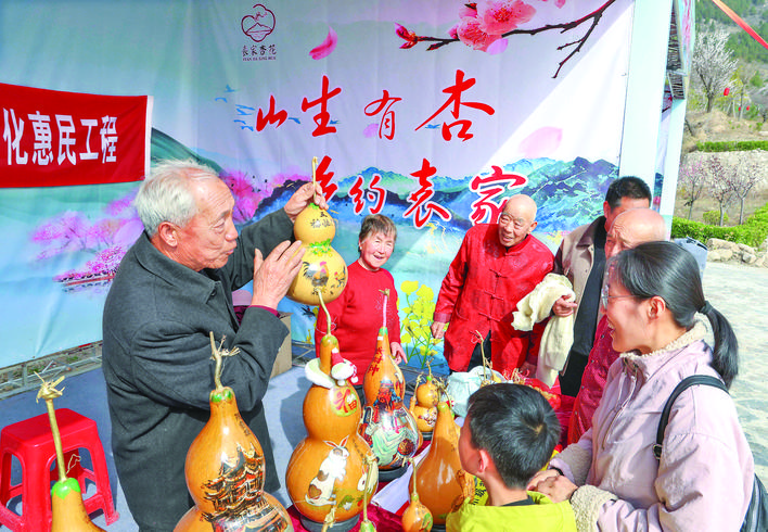 近日,在万荣县皇甫乡南吴村的非遗展厅,万荣葫芦烙画代表性传承人吴从礼在向游人介绍产品。特约摄影 李克荣 摄