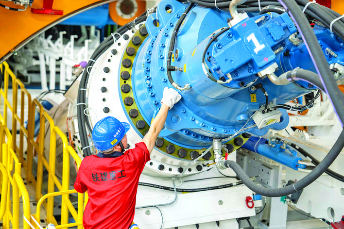 3月26日,工人在铁建重工长沙第二产业园调试“强基号”掘进机。 当日,由杭州市水务集团、铁建重工、中铁十八局等单位联合打造的我国最大直径土压平衡双护盾组合式隧道掘进机“强基号”在长沙顺利下线。据了解,“强基号”最大开挖直径达12.68米,整机长107米,总重量3500吨,未来主要承担扩大杭嘉湖南排后续西部通道工程南段12.28公里输水隧洞的掘进任务。 新华社记者 陈思汗 摄