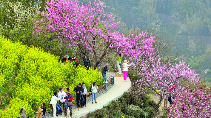 3月26日,游客在安徽省黄山市歙县霞坑镇石潭村春游赏花(无人机照片)。 春日时节,在安徽省黄山市歙县霞坑镇石潭村,漫山遍野的油菜花和桃花等肆意绽放,和山川、民居相映成趣,浓浓春意吸引众多游客前来春游赏花。 新华社发(樊成柱 摄)