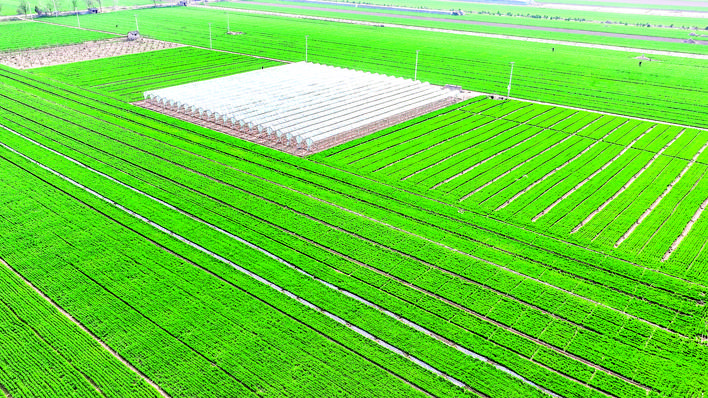 3月26日,无人机拍摄的夏县裴介镇农田,麦苗郁郁葱葱、蔬菜大棚整齐壮观,恰似一幅春意盎然的秀美画卷。 特约摄影 姚中吉 摄