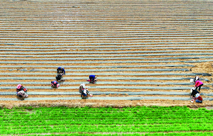 3月26日,万荣县通化镇六毋村村民抢抓农时铺地膜、播种药材。