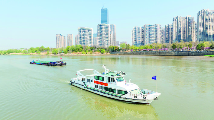 3月26日,江都水政执法人员驾驶执法艇在南水北调东线源头江都水利枢纽工程水域开展巡河工作(无人机照片)。 江都水利枢纽工程位于江苏省扬州市境内京杭大运河、新通扬运河和淮河入江水道交汇处,主要由4座大型泵站、12座大中型水闸以及输变电工程、引排河道等组成。 新华社发(郁 兴 摄)