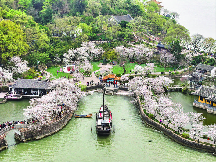 游人在无锡太湖鼋头渚风景区观赏樱花(3月27日摄,无人机照片)。 近日,江苏省无锡市太湖鼋头渚风景区樱花迎来盛花期,花海如云似雪,游人纷至沓来,尽享浪漫时光。 新华社记者 季春鹏 摄