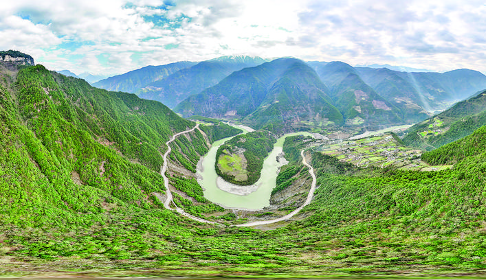 3月28日在云南怒江州贡山县丙中洛镇拍摄的怒江第一弯(无人机全景照片)。 近日的怒江峡谷,碧罗雪山与高黎贡山如巨屏相峙,雪峰残白,两岸绝壁新绿初绽,古朴的村庄点缀其间,构成一幅春日里的美丽画卷。 新华社发(彭奕凯 摄)