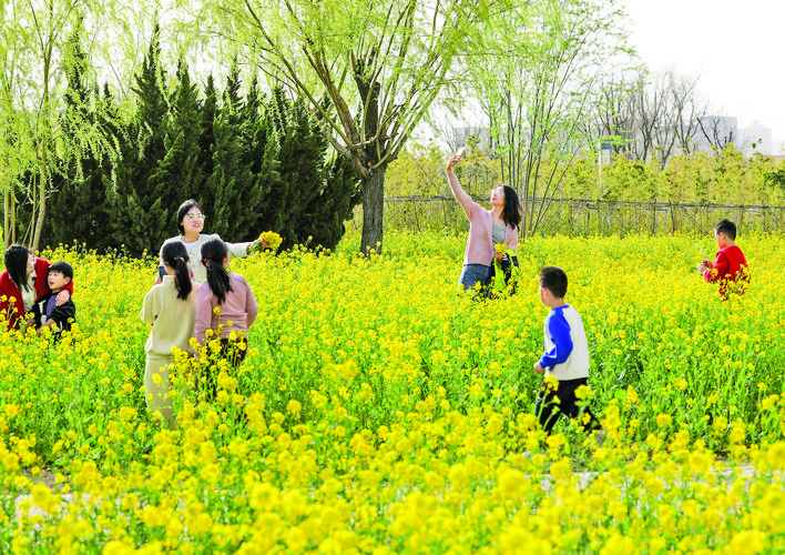 仲春时节,中心城区禹都公园油菜花盛开,吸引众多市民打卡拍照(3月26日摄)。