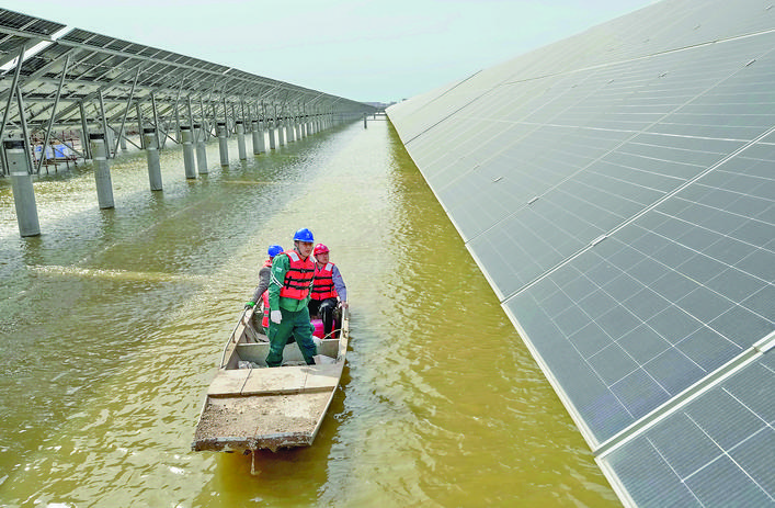 3月29日,河北省沧州市国网沧州供电公司的工人在辖区南排河镇一处“渔光互补”光伏发电场巡检(无人机照片)。 新华社记者 杨世尧 摄