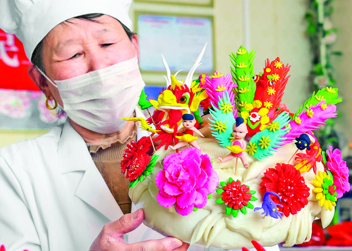 清明节到来之际,该面塑铺根据民间用“子福”花馍祭祖的习俗,组织员工加班加点,纯手工制作造型夸张、憨态可掬、不含任何添加剂的盘蛇、飞燕、老虎、莲花和龙凤插花等各类“子福”花馍3万余个,尽力满足客户上门订货需求。图为完工的“子福”花馍。