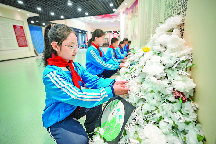 ▲4月2日,运城市海仓学校学生在盐湖区烈士陵园祭扫革命先烈。 清明将至,我市组织开展祭奠活动,缅怀先烈,寄托哀思。