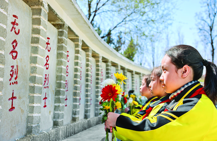4月2日,山东省枣庄市市中区文化路小学学生在枣庄革命烈士陵园向无名烈士敬献鲜花。 新华社发(孙中喆 摄)