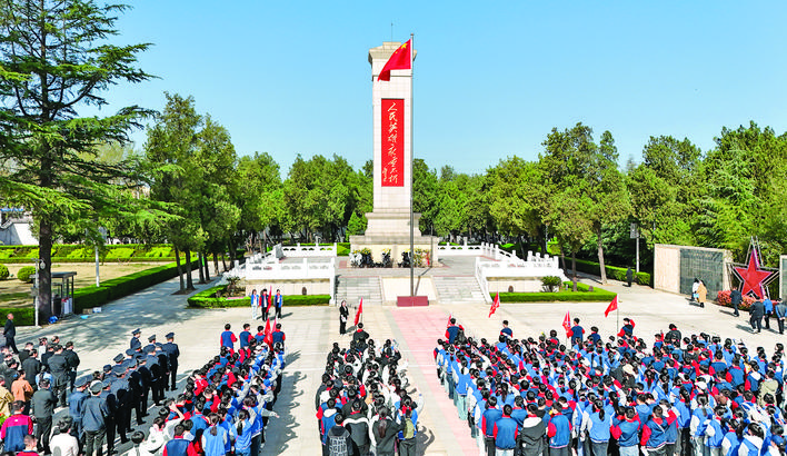 4月2日,人们在河南省平顶山市宝丰县烈士陵园革命烈士纪念碑前缅怀先烈(无人机照片)。 新华社发(何五昌 摄)