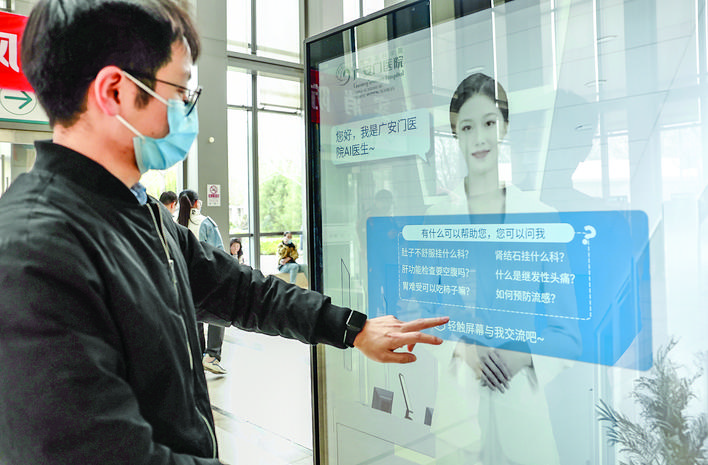 3月28日,患者在广安门医院门诊大厅体验AI导诊服务。 当日,“AI赋能医院高质量发展论坛暨广安门医院中医医疗服务大模型发布会”在北京举行。中国中医科学院广安门医院在会上正式发布“广医·岐智”大模型,成为国内首家本地化部署“算力+模型+应用”一体化服务的中医医院。 新华社记者 张玉薇 摄
