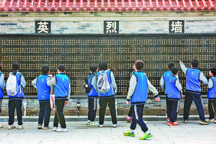▲3月31日,学生在盐湖区烈士陵园瞻仰英烈墙。