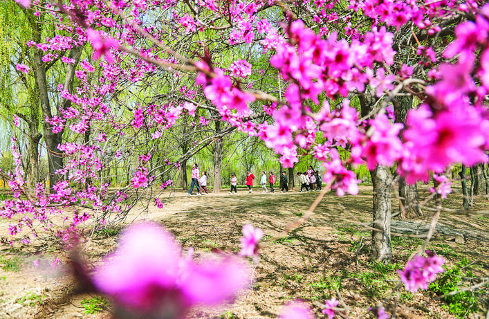 ▲4月3日,游客在山东省东营市广饶县李鹊镇一公园踏青赏花。