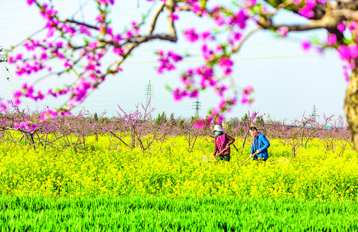 4月6日,平陆县部官镇计都村村民在对油菜地进行除草管护。