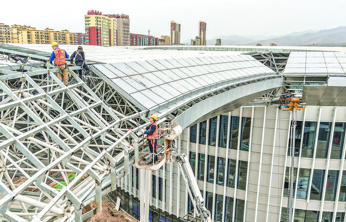 4月4日,在绛县涑水新区城市会客厅项目建设工地,工人们正加紧施工。