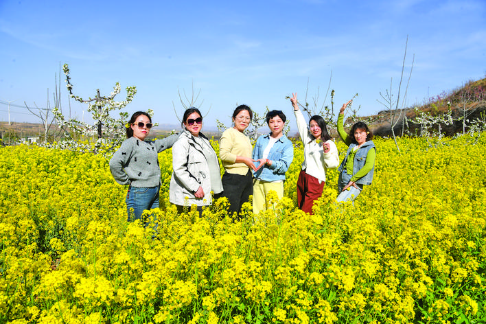 ◀清明假期,闻喜县河底镇下庄村休闲采摘生态园里,游人在花田拍照打卡。该村近年来在荒岭上完成农业生产条件改造后,栽植优良品种油桃、苹果、樱桃、杏200多亩,建成春季花飘香、秋来硕果繁的“花果山”。