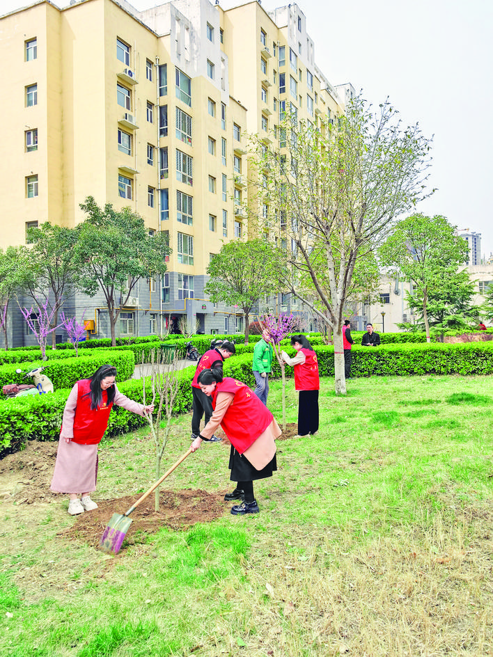 3月31日,河阳社区虞国壹号小区花园内一片热火朝天景象:县直工委、县住建局、县果业发展中心的在职党员身着红马甲,挥锹铲土、扶苗浇水,一株株新栽的紫荆花在春风中摇曳生姿,为小区增添了几分春色。